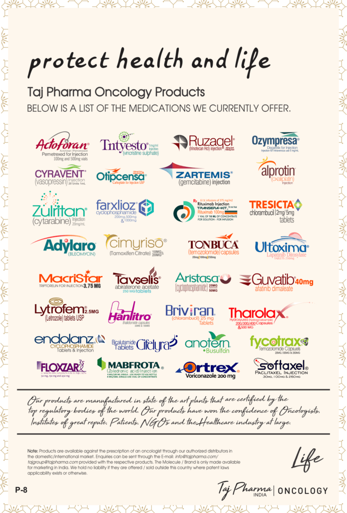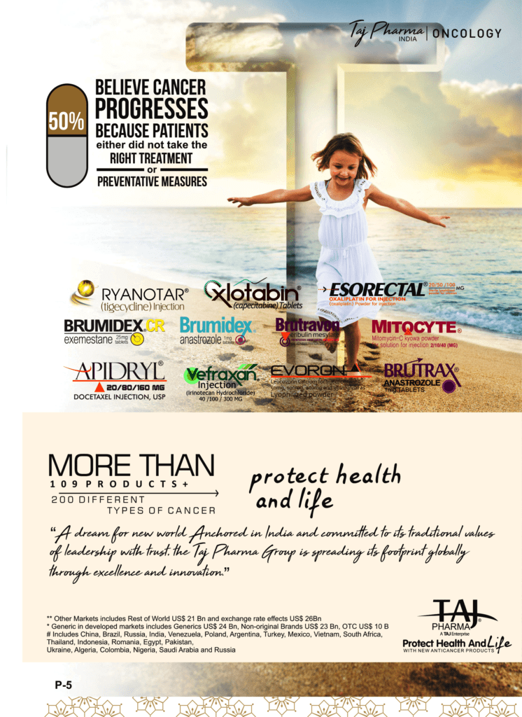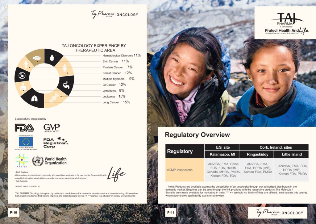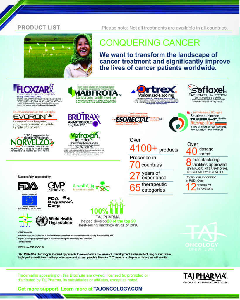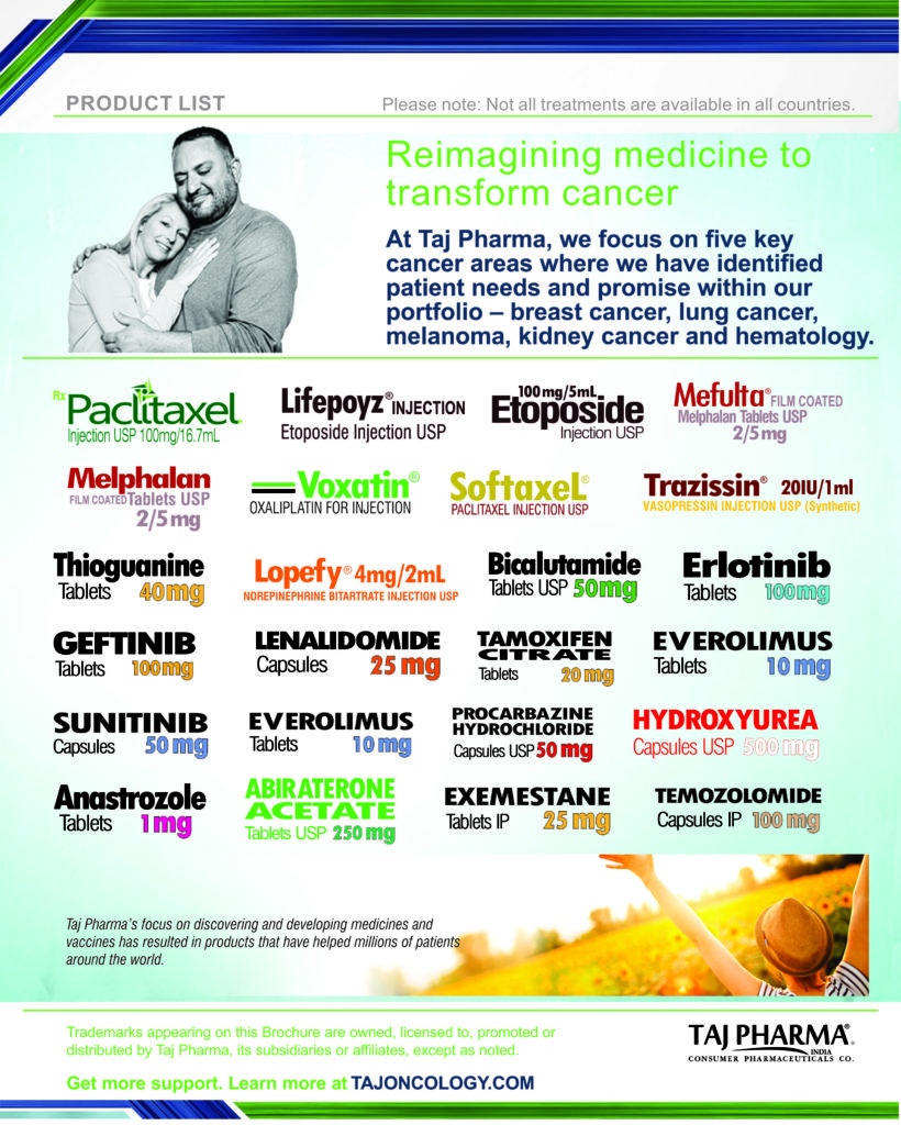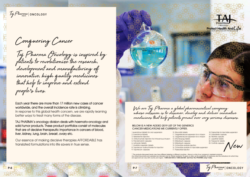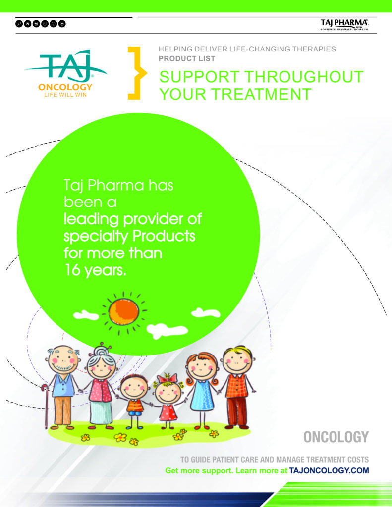 Taj Pharmaceuticals is the global leader in generics and one of the India’s top ten pharmaceutical companies. Taj Pharma India play a leading role in therapeutic areas such as cancer, virology and transplantation. The combined strengths of Taj Pharma generics and pharmaceuticals businesses, coupled with expertise in the emerging genetic sciences, equip us to develop integrated healthcare solutions and therapeutic approaches tailored to individual patients’ needs. Taj Pharmaceutical’s products and services address the entire healthcare spectrum, from screening for genetic risk factors, to preventing, diagnosing and treating disease, and monitoring the treatment response.