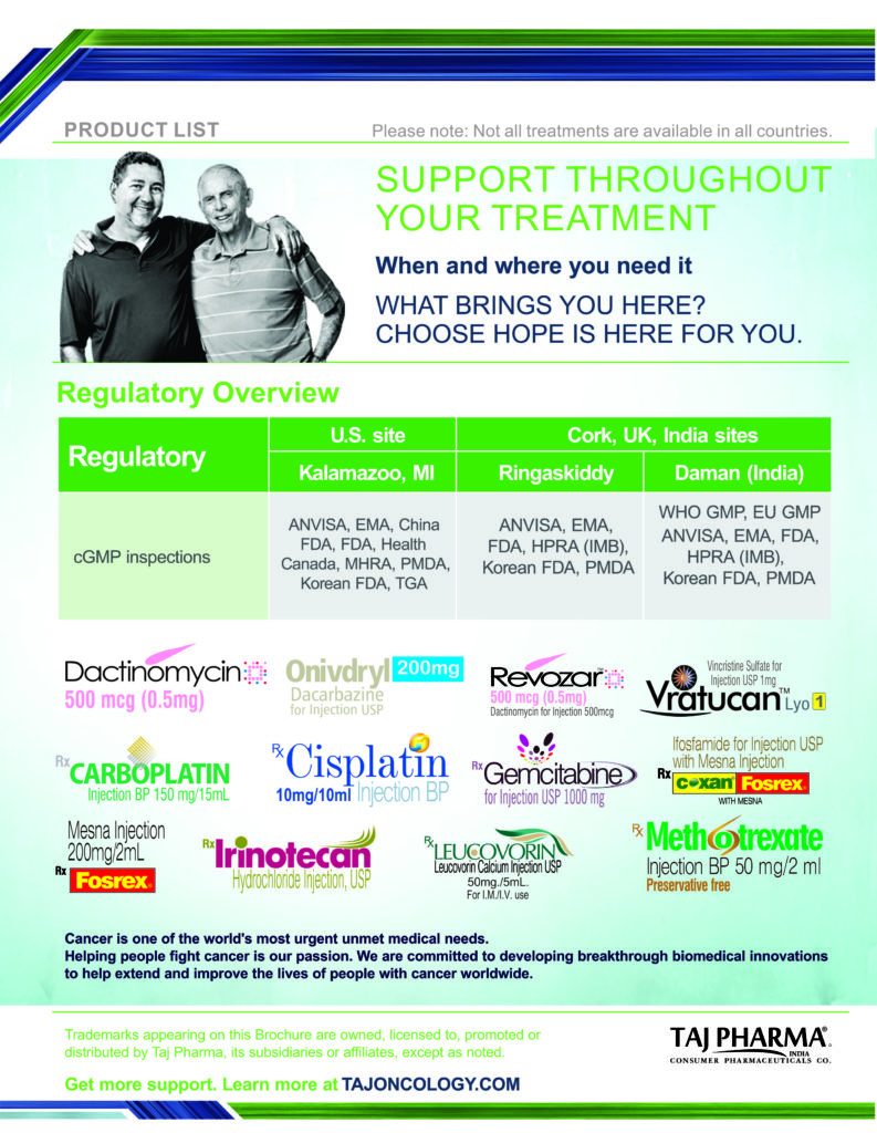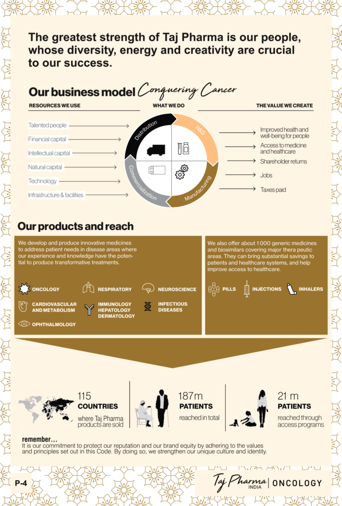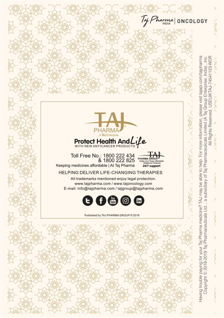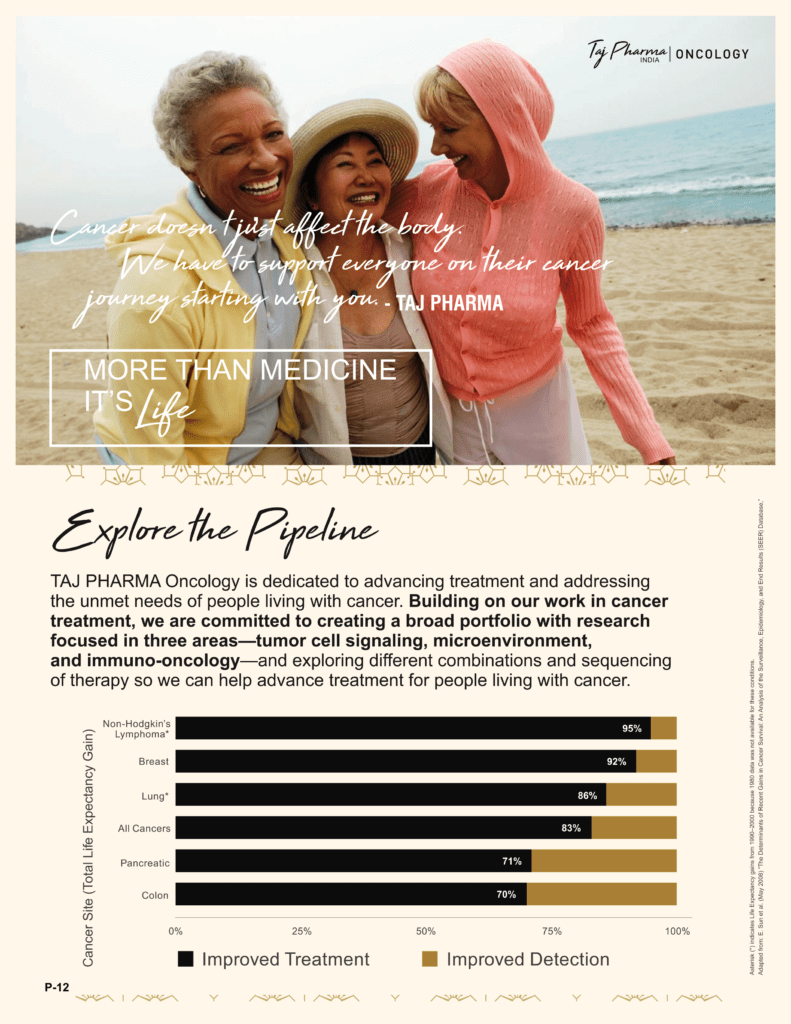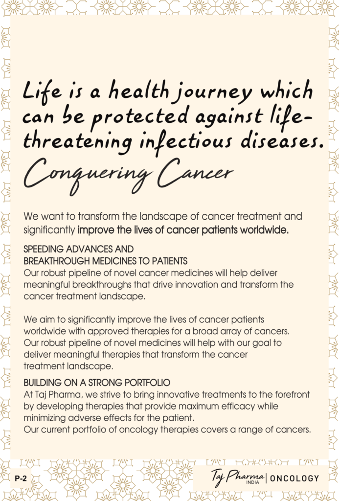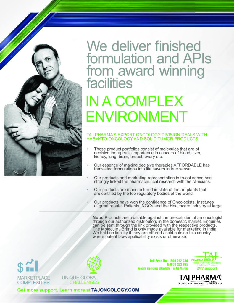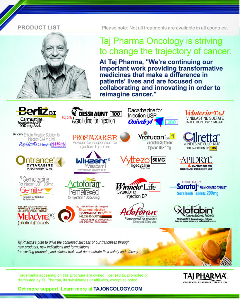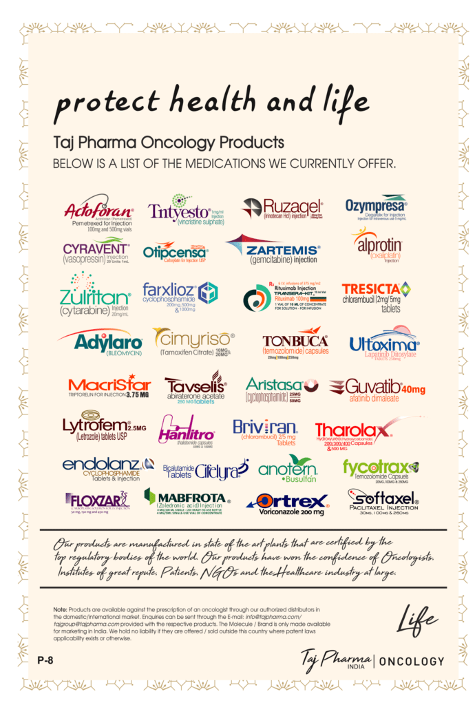 Taj Pharmaceuticals is the global leader in generics and one of the India’s top ten pharmaceutical companies. Taj Pharma India play a leading role in therapeutic areas such as cancer, virology and transplantation. The combined strengths of Taj Pharma generics and pharmaceuticals businesses, coupled with expertise in the emerging genetic sciences, equip us to develop integrated healthcare solutions and therapeutic approaches tailored to individual patients’ needs. Taj Pharmaceutical’s products and services address the entire healthcare spectrum, from screening for genetic risk factors, to preventing, diagnosing and treating disease, and monitoring the treatment response.